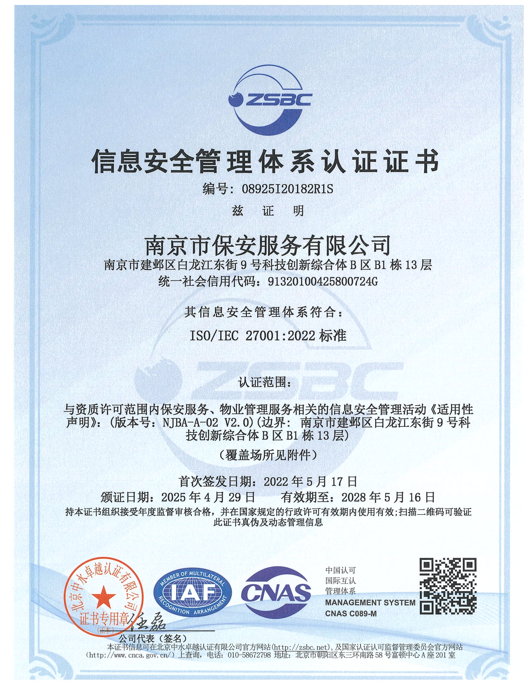 信息安全管理體系認(rèn)證證書