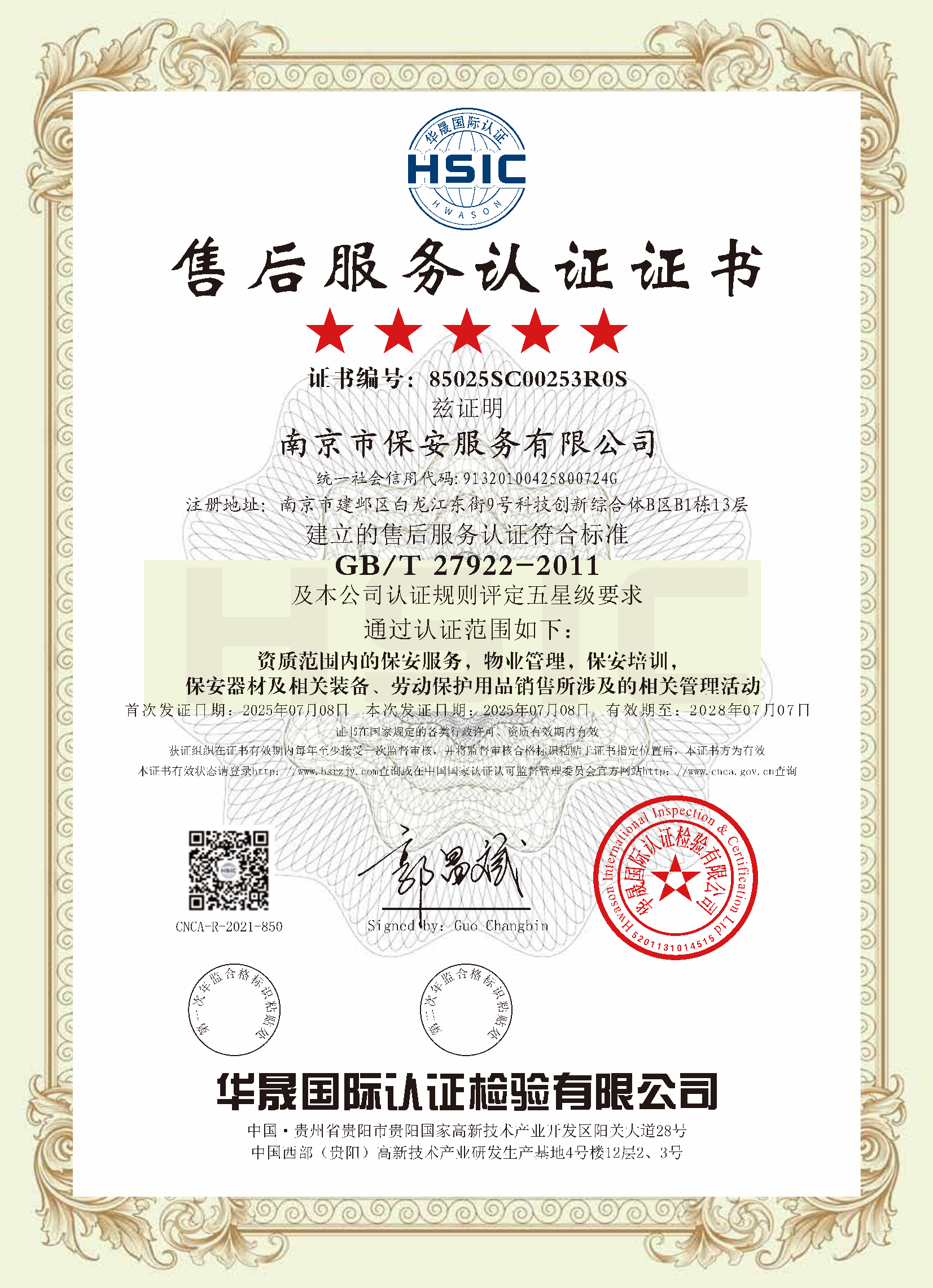 保安服務(wù)一級(jí)認(rèn)證證書